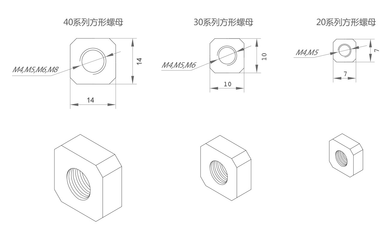 方形螺母是國際型材的專用螺母,用在國際型材上連接各種配件,安裝時需要預先放進型材的槽坑內(nèi)。